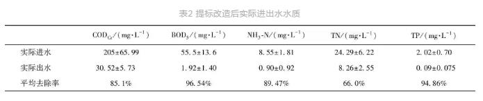 本次升級改造工程于2018年8月中旬完成,水量達到設計值4萬 m3/d條件下,所投加的懸浮載體完成掛膜。分析2019年1月1日—2019 年6月25日共計176 d的進出水水質數(shù)據(jù)(包含整個冬季運行階段),結果如表2所示。