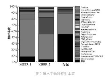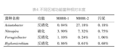 圖2中MBBR-1和MBBR-2為生化池不同區(qū)域的懸浮載體,污泥為生化池活性污泥。各部分的主要菌種及相對豐度如表4所示。
